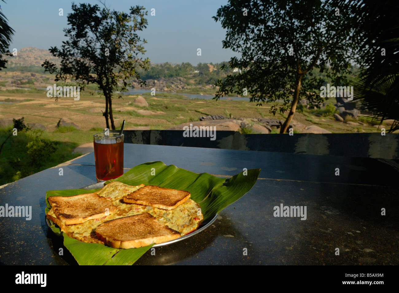 Breakfast With Glorious View Omelette And Tea Served On A Palm Leaf In Mango Tree Restaurant India Karnataka Hampi Stock Photo Alamy